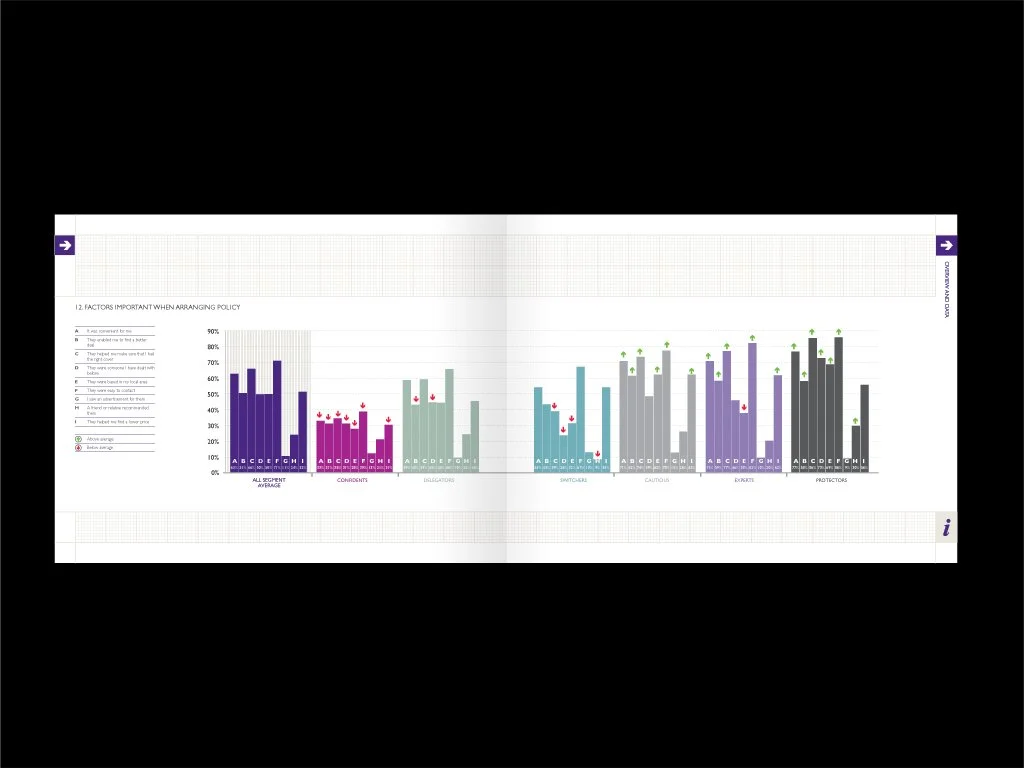 The full set of research data was visualised in a separate booklet for those requiring deeper insight. I highlighted areas where each segment deviated significantly from the norm, clearly indicating which factors mattered more–and less–than average.