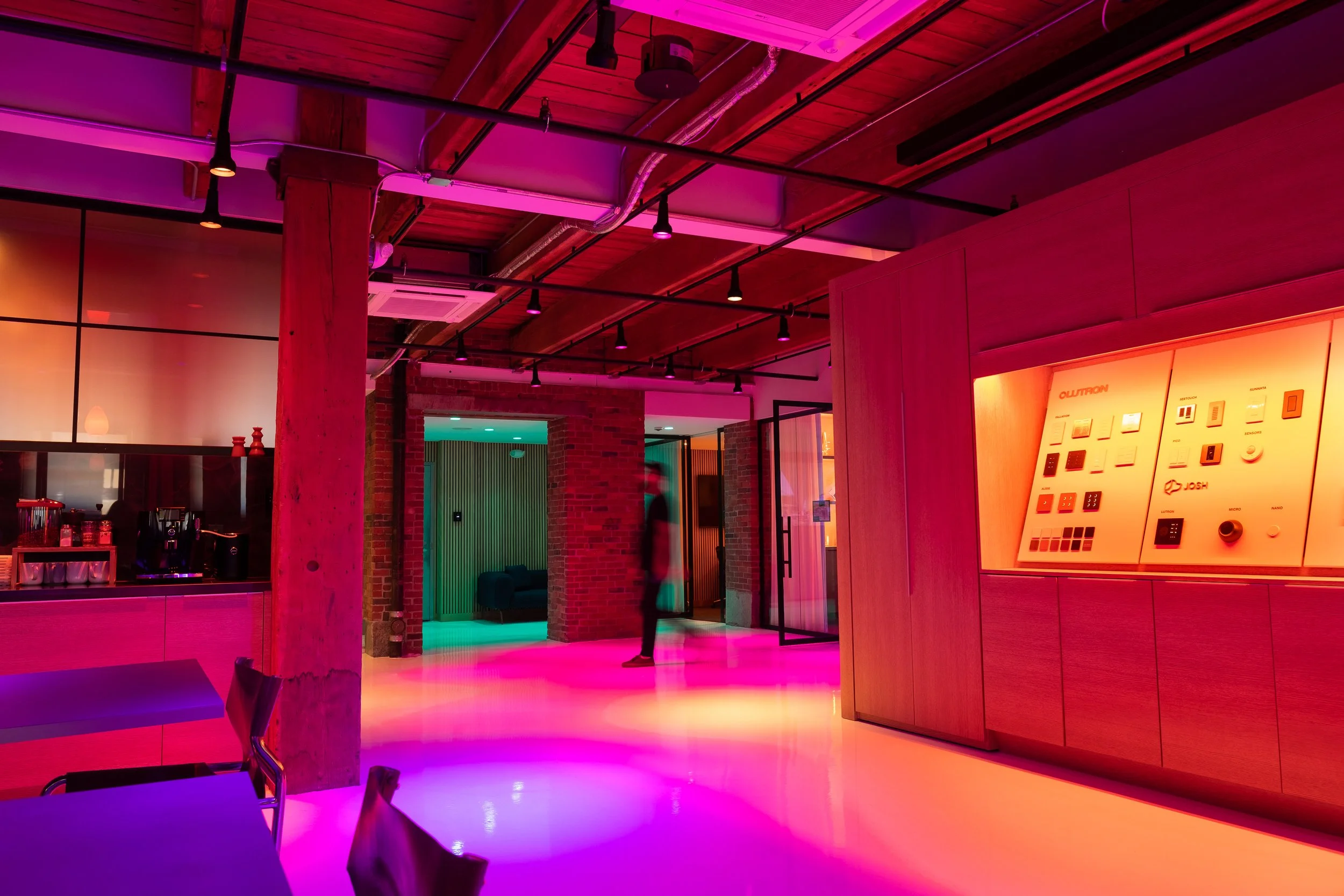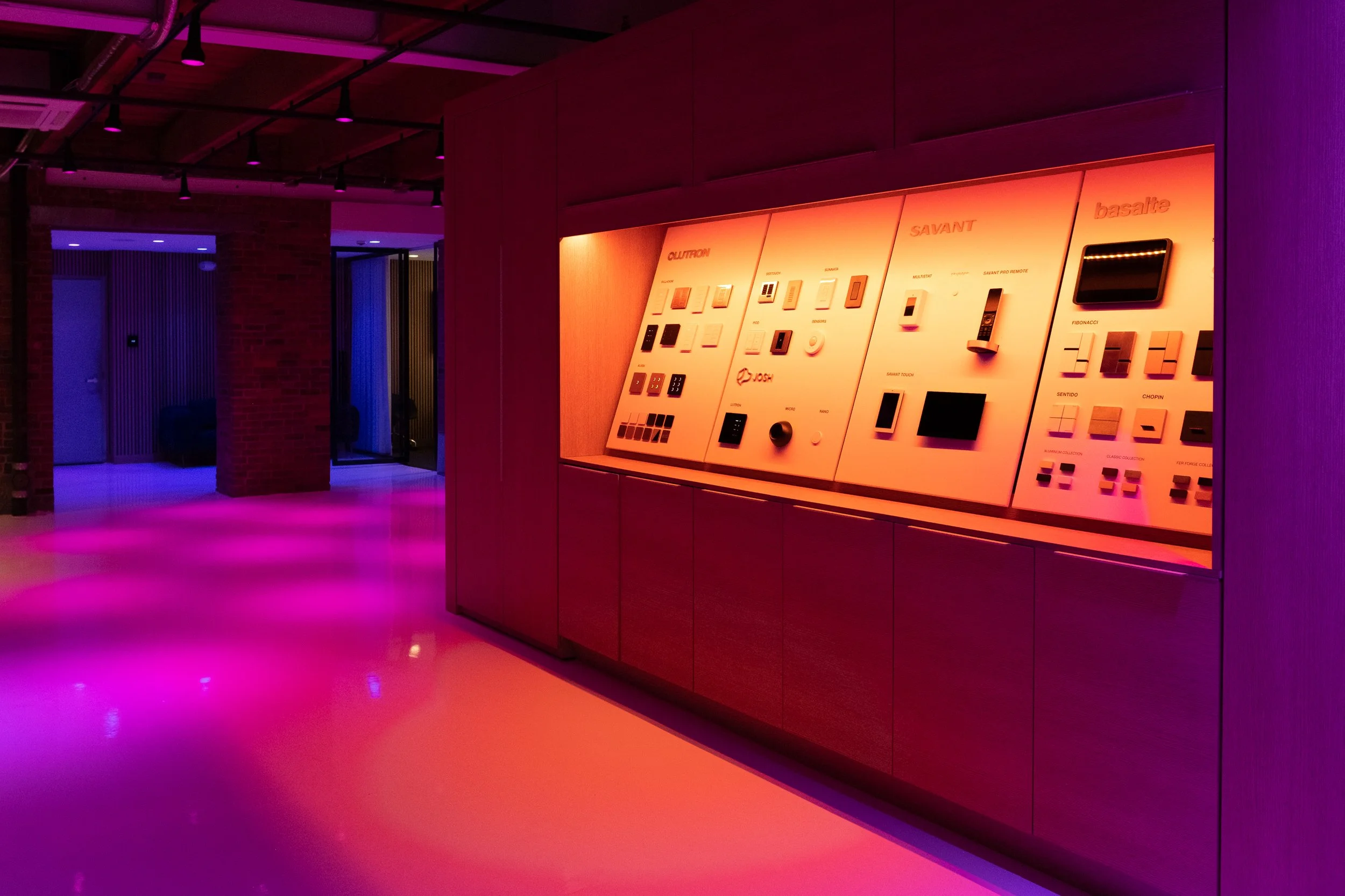 As part of a brand refresh, I conceptualised and designed a new showroom, defining the client journey and visual language across the space, including a custom reception desk, interactive keypad wall, events area, and hidden cinema.